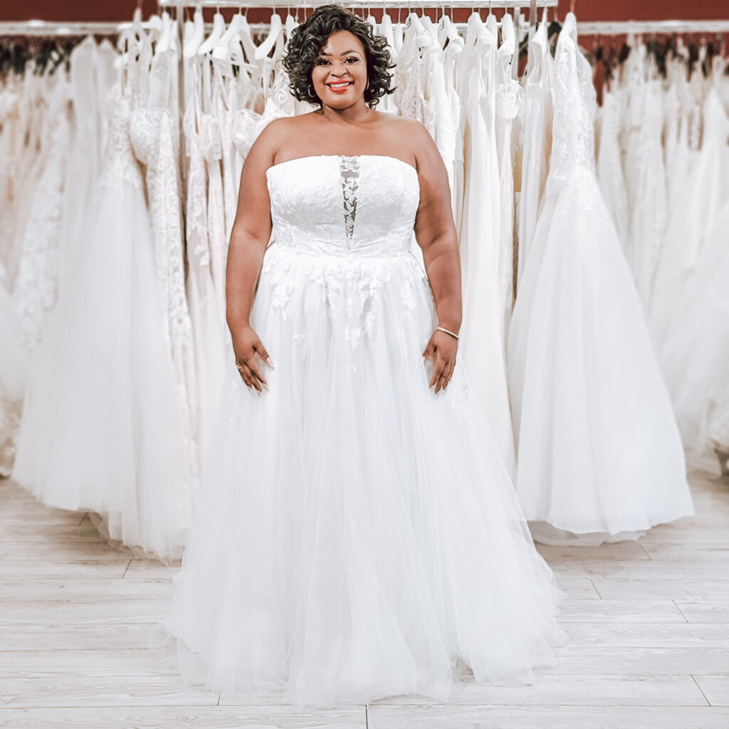 Are the high seas calling you to have your wedding on the water? Scarlett Belle River Boat is ready to help you set sail to the start of your new voyage together. With this intimate venue, you have the tranquility of the see as your background and all-inclusive packages helps to take some of the stress of planning away. Enjoy the amazing and romantic sunset as you and your guest cruise around the harbor. One recommendation we have for getting married on a boat is that sometimes walkways are a bit more narrow. For weddings on boats we recommend an aline wedding dress, like this straight neckline lace and tulle aline wedding dress with V plunge bodice, available in plus sizes in our Whittier, California bridal store.